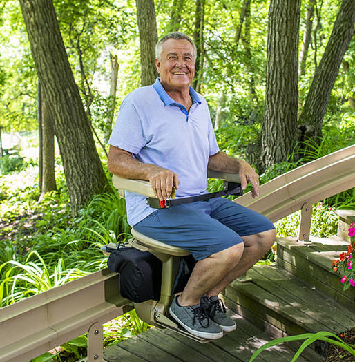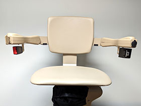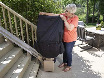 Weather Resistant Marine-grade vinyl, durable outdoor paint and lightweight cover protects Bruno’s Elite straight outdoor stairlift from the elements. Performance tested 0°F - 125° F Space-Saving Design Narrow vertical rail maintains maximum open space on steps. Footrest, arms, seat fold when not in use. Easy Operation. Armrest control glides stairlift up and down. Seat swivels up to 90° at top landing for safe exit. Keyed remote call/send also standard. High-Quality Engineering. Unique covered gear rack on rail reduces exposure to grease, dirt. Smooth, quiet ride. Reliable, Safe Battery-operation ensures lift works even in power outage. Obstruction sensors and retractable seat belt help ensure rider safety. |
